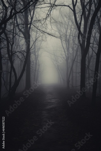 Misty spooky forest background, gloomy trees in scary horror foggy woods Happy Halloween dark night creepy nature mist fantasy atmosphere mystery dramatic landscape fall nightmare scenery. Copy space