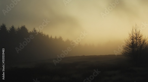 Misty sunrise over a tranquil forest, silhouettes of trees emerge from the fog, golden light illuminating the scene