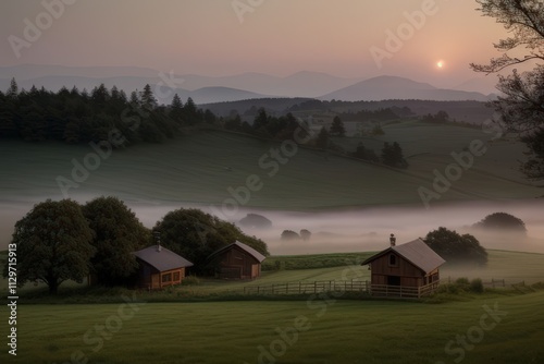 Misty Sunrise over Alpine Meadow: Rustic Charm