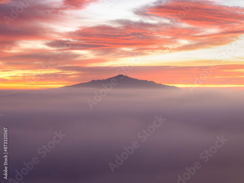Misty sunrise over mountain peak at La Pedriza
