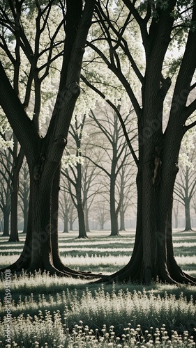Misty Tree Grove, Enchanted Forest, Sunlit Trees, Magical Woods