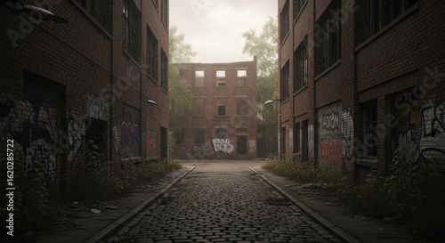 Misty urban decay showcasing a forgotten alleyway with brick structures and cobblestone path
