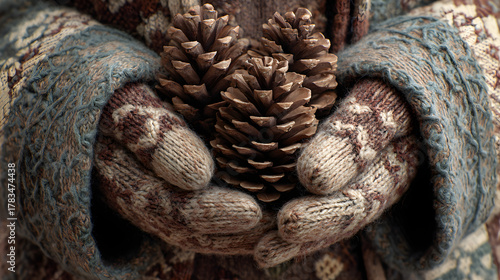 Mittens holding pine cones, cozy tactile texture and emotional warmth
