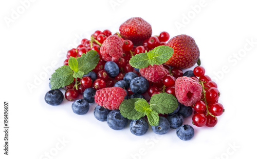 Mix berries and isolated on a white. Ripe blueberries, raspberries, red currants and strawberries with mint. Berries and fruits with copy space for text.