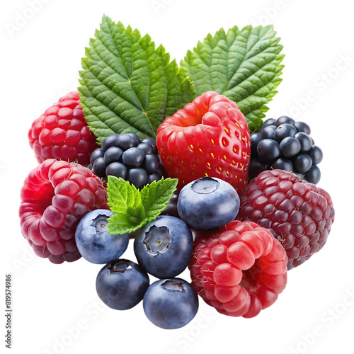 mix berries in closeup with leaf on transparent background