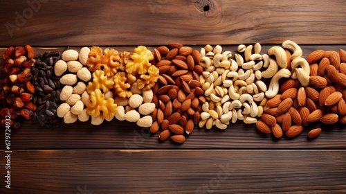 Mix of dried fruits and nuts on wooden background. Top view. Almonds, cashew and other healthy fruits. Organic and healthy