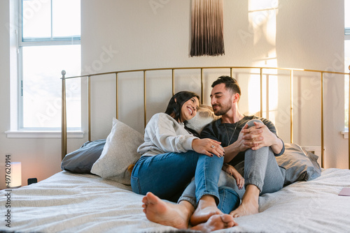 Mixed couple in love happily relaxing in bed