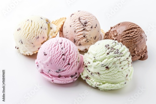 Mixed ice cream scoops with cone on white background