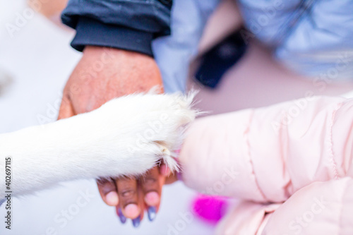 mixed race family in threesome spending new year holidays in park with their husky dog