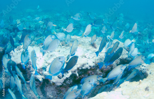 Mixed School of Blue Tangs, Doctorfish, and Ocean Surgeonfish