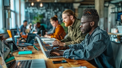 Mixed team of business analysts and developers working on laptops in a contemporary open-plan office