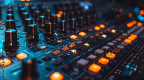 Mixing console with neon lighting reflected from smooth surfaces