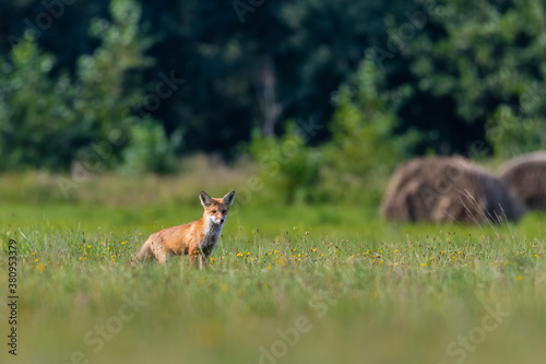 Młody lis rudy Vulpes vulpes na zielonej łące - naturalne środowisko lisa - krajobraz wiejski