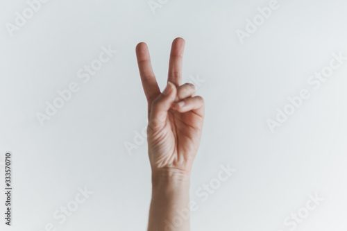 Mão de mulher branca fazendo o número 2 ou símbolo de vitória