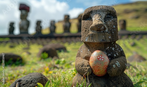 Moai statue holding a decorated easter egg on Easter Island with other moai and a stone rabbit in the background