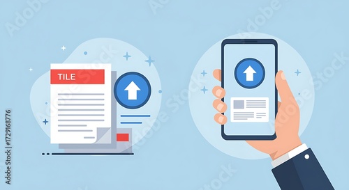 Mobile application file upload concept with smartphone in hand vector illustration flat design and modern technology for business promotion and presentations