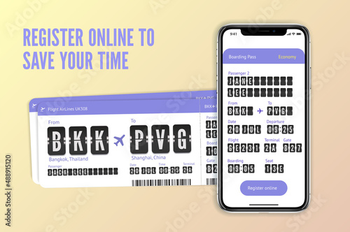 Mobile Boarding pass concept. Online tickets ads template. Electronic Flight card for online registration.