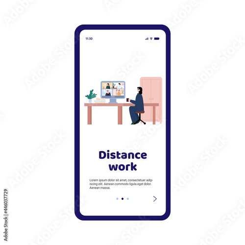 Mobile onboarding page on topic of distance work, cartoon vector illustration.