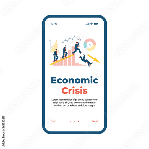 Mobile onboarding page template of economic crisis and financial crash concept with business people characters, cartoon vector illustration isolated on white background.