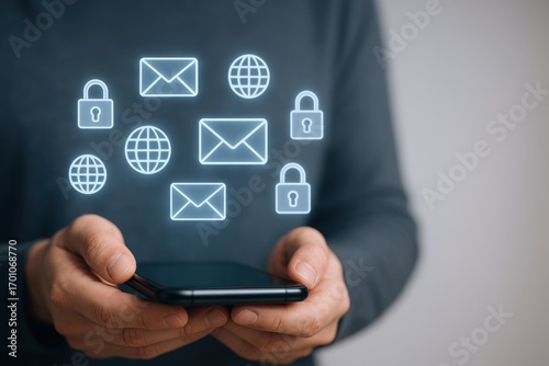 Mobile Security: Man Holding Phone with Security Icons for Email, Global Network, and Data Protection