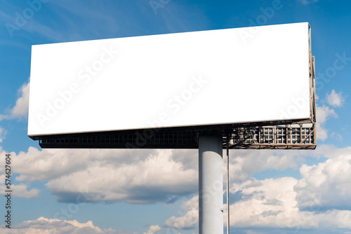Mock up - blank wide white billboard or large advertising display against blue sky with white clouds. Consumerism, white screen, template, mock up and copy space concept