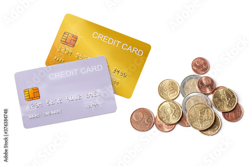mock up demo credit card with euro money banknote and coins on white background.