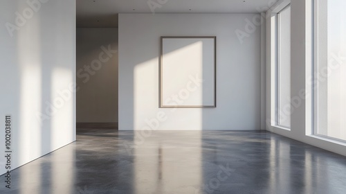 Mock up frame in a bare exhibition room with warm white walls and polished concrete floors, 3D render