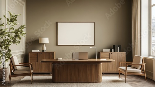 Mock up frame in a spacious, bare business office with pale olive walls and simple wooden furniture, no decorations, 3D render