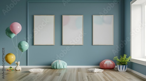 Mock up posters and a vibrant lamp in a child's room with a blue wall, 3D rendering