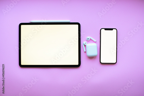 Mockup . Tablet ipad, iphone l and air pods on pink background