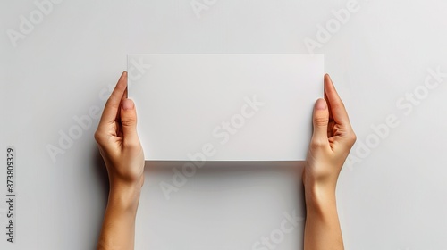 Mockup booklet presentation: Woman's hands hold blank white flyer on white background