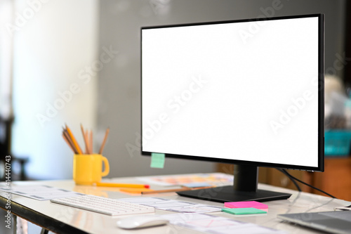 Mockup computer big blank screen on a professional designer desk in a comfortable office.