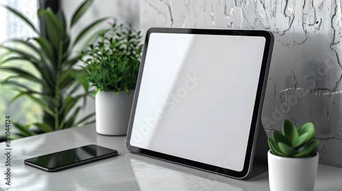 mockup digital tablet with empty screen, placed on workspace to demonstrate app and software designs