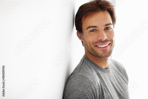 Mockup, happy and portrait of man on a white background with casual style, fashion and trendy clothes. Smile, relax and face of person with confidence, pride and positive attitude in studio space