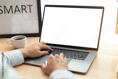 mockup image blank screen computer with blank white background for advertising text,hand man using laptop contact business search information on desk at home office.marketing and creative design