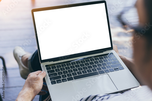 mockup image blank screen computer with white background for advertising text,hand man using laptop contact business search information on desk at coffee shop.marketing and creative design