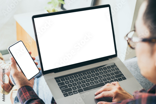 mockup image blank screen computer,cell phone with white background for advertising text,hand man using laptop texting mobile contact business search information on desk in office.marketing and design