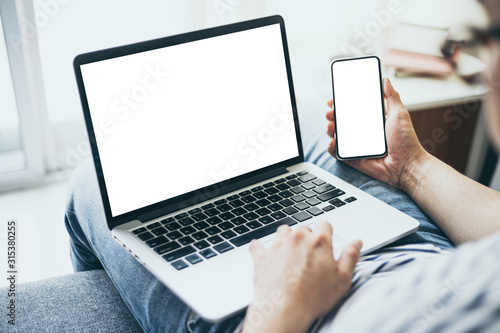 mockup image blank screen computer,cell phone with white background for advertising text,hand woman using laptop texting mobile contact business search information on desk in cafe.marketing,design