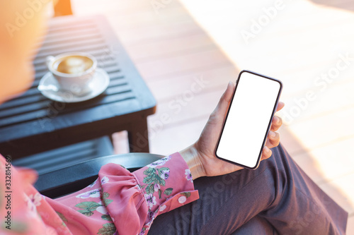 Mockup image blank white screen cell phone.woman hand holding texting using mobile on desk at coffee shop.background empty space for advertise text.people contact marketing business,technology