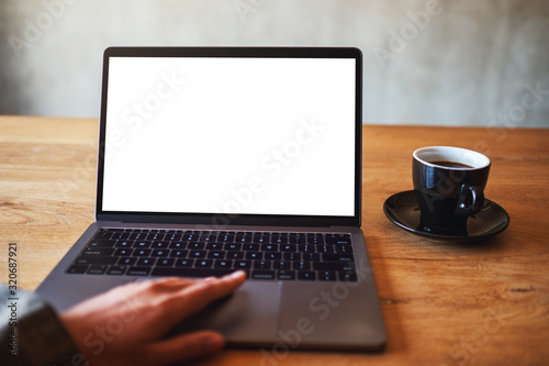 Mockup image of a woman using and touching on laptop touchpad with blank white desktop screen with coffee cup on the table