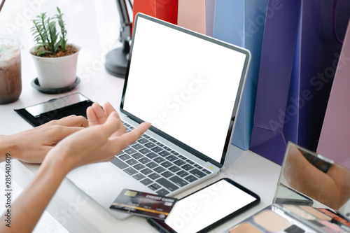 Mockup image of beautiful woman holding credit card enjoying in shopping website online with smartphone and laptop, mockup concept