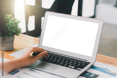 Mockup image of business woman using and typing on laptop with blank white screen.