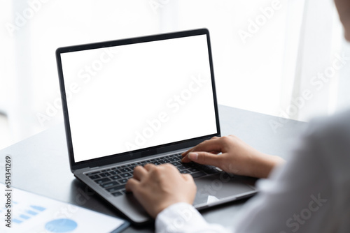 Mockup image of business woman using and typing on laptop with blank white screen.