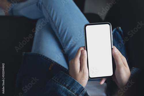 Mockup image of cell phone. Woman hand holding texting using blank white screen mobile phone. Female hipster in blue jeans using and looking at empty smartphone screen