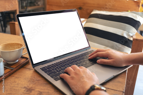 Mockup image of hands using and typing on laptop with blank white desktop screen with coffee cup on wooden table in cafe