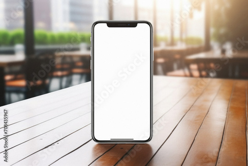 Mockup image of smartphone with blank white screen on wooden table in cafe