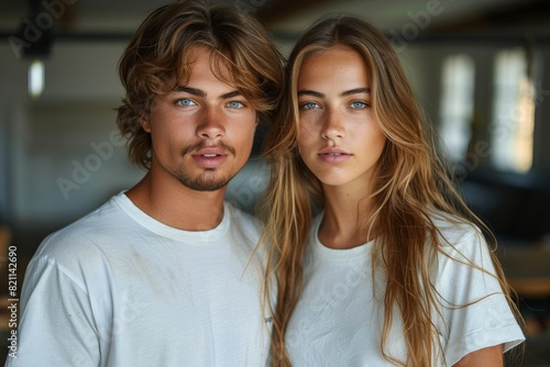 mockup mixte couple with 2 white tshirt, photography, shiny