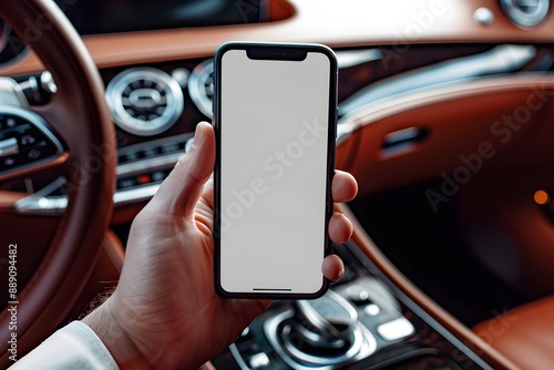 Mockup of a blank app interface on a smartphone held in a person’s hand with a luxury car interior as the background