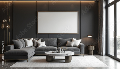 mockup of a blank framed picture hanging on a grey wall in a modern living room. It features a black sectional sofa, a marble coffee table, plants, and a window with sunlight streaming in.