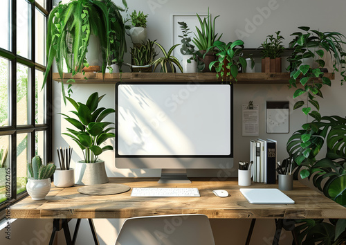Mockup of a modern desktop computer with a blank white screen on a rustic wooden desk in a home office interior